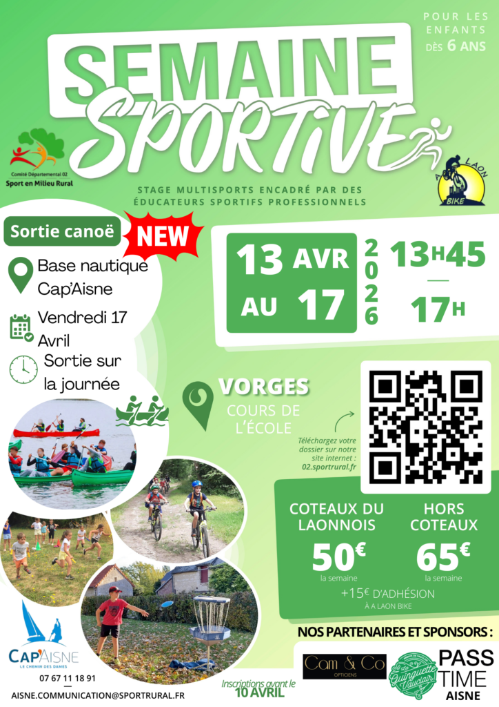 🏆 Les semaines sportives, organisées en collaboration avec A LAON BIKE, permettent à vos enfants de découvrir et tester une multitude de sports à raison de trois activités par jour ! 🚴♂️🎯🏐 Parmi les disciplines proposées : VTT, tir à l’arc, tchoukball, marche nordique, poull ball et bien d’autres encore ! Ces semaines sont ouvertes à tous les enfants à partir de 6 ans.